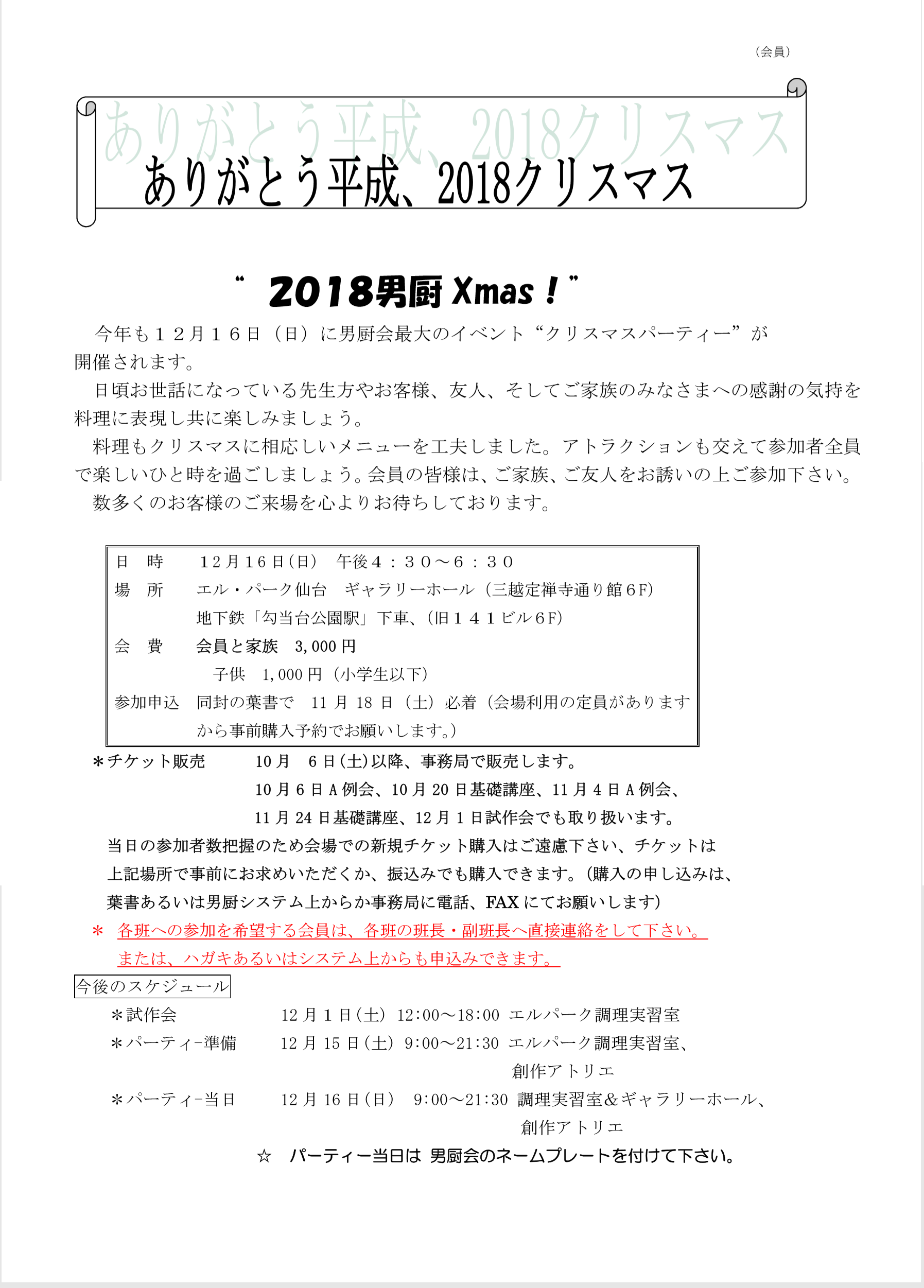 日頃は仙台男厨会の活動にご協力いただき、誠に有難うございます。 平成30年12月16日(日)の「2018年クリスマス」チケット販売の ご案内をさせていただきます。