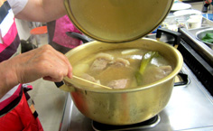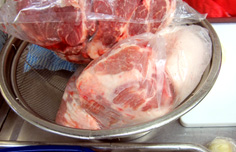 豚肉を水から茹でる。以下の材料と一緒に。 ※ニンニク(皮をむかない) 1片 タマネギ(そのまま) 小さめの物1/2個 ショウガ(スライス)3〜4枚 長ネギ1/2本 酒 90cc 味噌(臭い消し) 大さじ1 ミリン 大さじ1