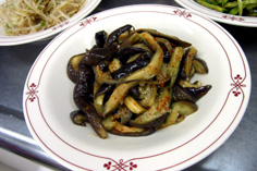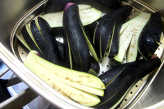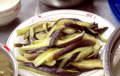 ナスのナムル ナス 4個 ※ヤムニョン ニンニク 1片 ショウユ・白だし 各大さじ1 すりゴマ 小さじ1 粉唐辛子(韓国の物) 小さじ1/2 ゴマ油 小さじ1 |