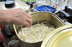 少なめの水に塩少々を入れて沸かし、モヤシを3分程茹でる |