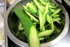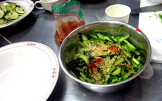 キュウリを千切りにして塩少々を振り、10分程おく。水気を軽くふき、ヤムニョンを加え |