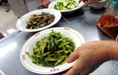火が通ったら、すりゴマをかけ皿に取る |