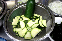 ズッキーニは縦半分に切り、薄切り。塩を振り、10分程おく。水気をふき |