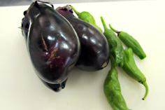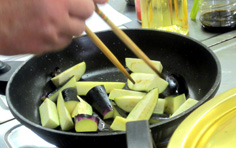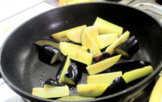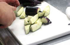 ナスは縦半分に切り、さらに横半分。櫛形に三等分 |