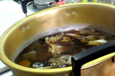 鍋に分量の水とダシを入れ、里芋、コンニャク、ゴボウを茹でる |