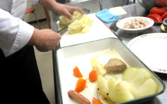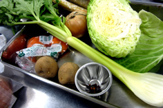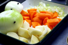 タマネギは縦に1/4位まで切り込みを入れ、クローブをさす。ニンジン、ジャガイモは乱切り、セロリは微塵切り |