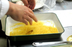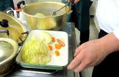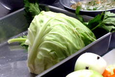 キャベツは、塊のままタコ糸をかけて、バラバラにならないようにする |