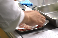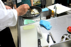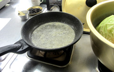 フライパンの表面に浮いている油をペーパーで吸い取り |