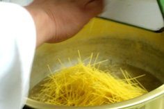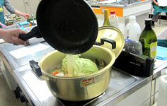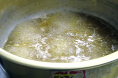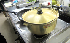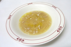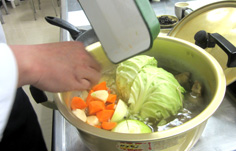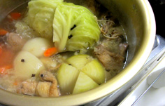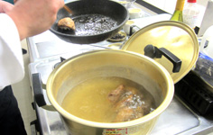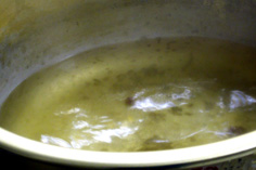 鍋に入れる。スープのアクをとったら、ローリエ、粒コショウを入れて煮込む |