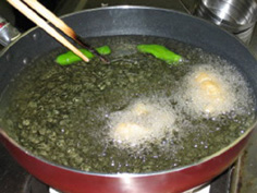 粉を付けた身が開くように、箸で振り入れて揚げる。しし唐は素揚げ |