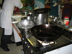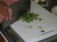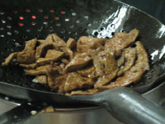 中華鍋に生姜と南蛮の薄切りを入れて炒め、合わせ調味料を入れて煮立たせ |