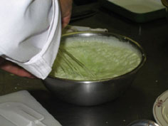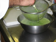 網でこしてボールに入れるが、今回は目の粗い網でこし、舌触りが残るようにしている |