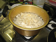 炊き上がったら、きざんだ野沢菜を混ぜ合わせるが、野沢菜の塩加減で全体の味を調節すると良い |