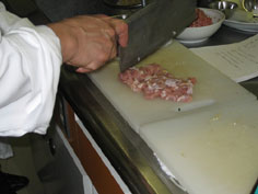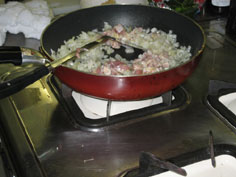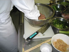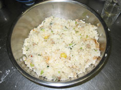 ねぎ油でアラ微塵に切った玉ねぎと鶏肉を炒める。 塩 大さじ1弱 コショウ XOジャン 大さじ2で味を付けておく |