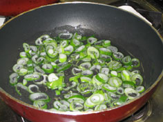 ねぎの青いところにサラダ油を入れ、 弱火でねぎが茶色になるまで炒める |