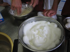 エビは背わたと殻を取り、塩水で洗う。塩、酒、こしょう、卵白、片栗粉、サラダ油 各少々で下味を付ける。 卵白2個分を泡たてる |