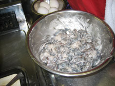 ボールに小麦粉 大さじ3、片栗粉 大さじ1、重曹 一つまみ、水 大さじ3 塩 一つまみを合わせ、泡立てた卵白をつぶさないように混ぜてエビの衣にする |