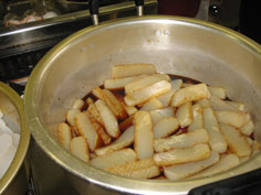 サラダ油でこんにゃくの両面に焼き色をつけ、熱湯で油抜きをする |