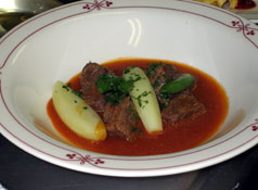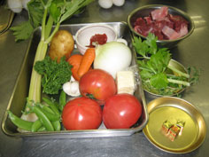 材料 4人分 ラムのモモ肉 480g 人参 100g 玉ねぎ 100g セロリ 1本 にんにく 2片 トマト 2個 トマトペースト 大さじ3 ブイヨン 600cc小麦粉 大さじ3 ブーケガルニ(セロリ・パセリ・タイム・ローリエ) 1束 バター 大さじ2 パセリ 適量 付け合せにポテト、スナックえんどう(それぞれ茹でておく) 適量 |