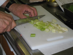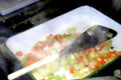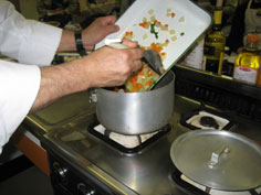 セロリ、人参、玉ねぎ、セロリの葉を加えて丁寧にソテーする |