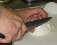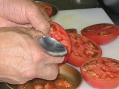 横半分に切ったトマトの種をスプーンの柄等で取り除く |