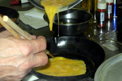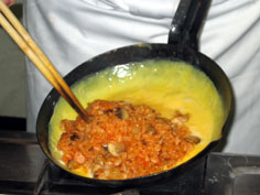 溶き卵に軽く塩・コショウをしてから、サラダ油をを熱くしたところに入れる |
