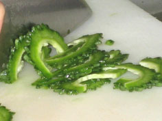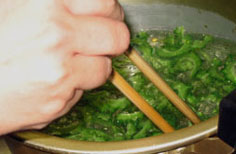 熱湯にゴマ油少々を入れニガウリを湯通しする。水で洗い軽くしぼる |
