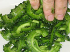 ニガウリを縦半分に切って種を取り、薄く切ったら塩少々を振って軽くもむ |