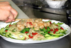 皿に、戻しておいた春雨を切って広げ、きゅうり、ニガウリを盛る。デザートの西瓜の白いところを薄く切り、軽く塩をして一緒に盛る |