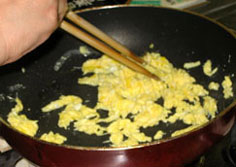 卵に塩少々を加え、煎り卵をつくる |