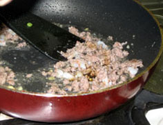サラダ油大さじ1でショウガと豚挽肉を炒める。肉から油が出るようになったらエビを炒め、醤油少々で味をつけ火を止める |