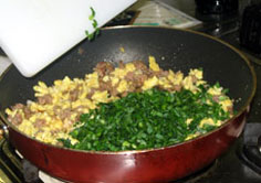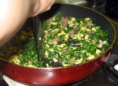 卵とサフラン(サフランとネギの炒め物の半分)、ニラをいれる |
