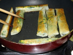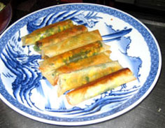 材料 4本分 サフラン 0.1g エビ 2尾 ニラ 1束 卵 2個 豚挽肉 100g ショウガ 1片 渇根粉少々 春巻きの皮 8枚 タレ(練り辛子、酢、各適宜) エビは1センチほどに切る |