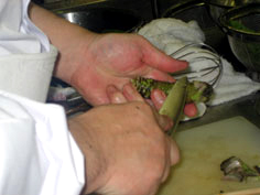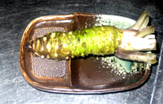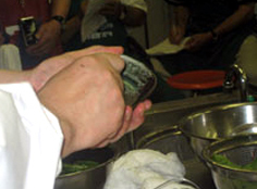 わさびは皮をむかず汚れを軽く落として、葉の付いている方からおろす |