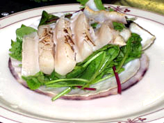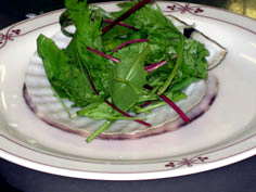帆立の殻を器にしてベビーリーフをのせる |