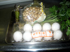 材料 5人分 玉子5個 しめじ1/2パック 鶏胸肉50g むき海老5尾 糸三つ葉少々 |