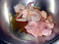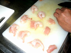 鶏肉は一口大の薄切り。海老は背わたをとる |