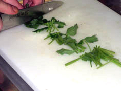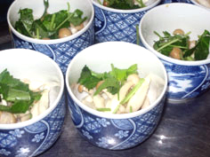 器に鶏肉、海老、しめじを入れ、三つ葉をのせる。三つ葉は出来上がってからでも良い |