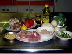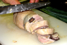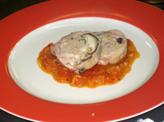 材料 4人分 (ラップ、たこ糸、蒸し器を用意) 鶏もも(250g位) 1枚 鶏ひき肉 60g しめじ 40g 生パン粉 15g 松の実 20g レモン薄切り 2枚 タイ ・ローリエ 生椎茸 4枚 トマトソースの材料 完熟トマト 2個 玉ねぎ 50g にんにく 1/2個 あさつき又は小ねぎ 適量 粒マスタード 20g レモン汁 小さじ1 ピュアオリーブ油 適宜 バージンオリーブ油 少々 付け合せ カリフラワー(小房) 4個 ブロッコリー(小房) 4個 シメジ 少々 マーシュ 4個 |