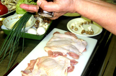 鶏もも肉は、身の厚いところを軽く開いて広げ、均等の厚さにする |