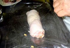 ラップを広げ、鶏もも肉を皮を下にして置く。茹でた生椎茸を並べる。両脇をしばるので、ラップは余裕をもたせて |