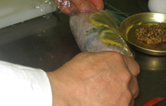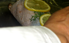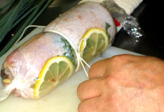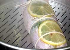 皮の上に、タイ とローリエの葉をおきレモンを乗せる |