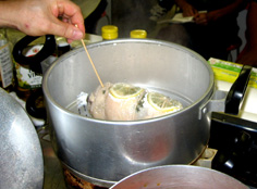 鶏肉に竹串を刺し、透明な汁が出てきたら火が通っている |