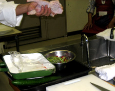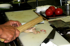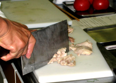昔は硬い肉を棒でたたいたので棒棒鶏と名が付いたが、今の肉は軟らかいので必要なし。これはサービスのデモンストレーション |