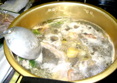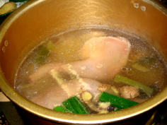 お湯にねぎの青い部分、ショウガの皮、塩少々、紹興酒少々を入れて鶏ももをボイルする。必ずお湯から。 |