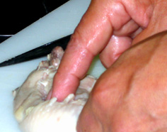 水気を良く拭いてから、骨に沿って包丁を入れる |