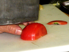 トマトはヘタを落とし、縦半分に切り、伏せて半月に薄く切る |