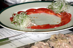 飾りの白髪ネギとラディッシュ。白い皿などに飾る時はネギの青いところも少し えると綺麗 |