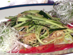 くらげの水気を切り、塩少々、ごま油少々で下味を付け、きゅうりの細切りと混ぜて中央にこんもりと盛る |