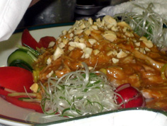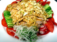 鶏肉の上に胡麻ソースを半分ほどかけ、カシュナッツを散らす。残りのソースは食べる時に適宜掛ける |